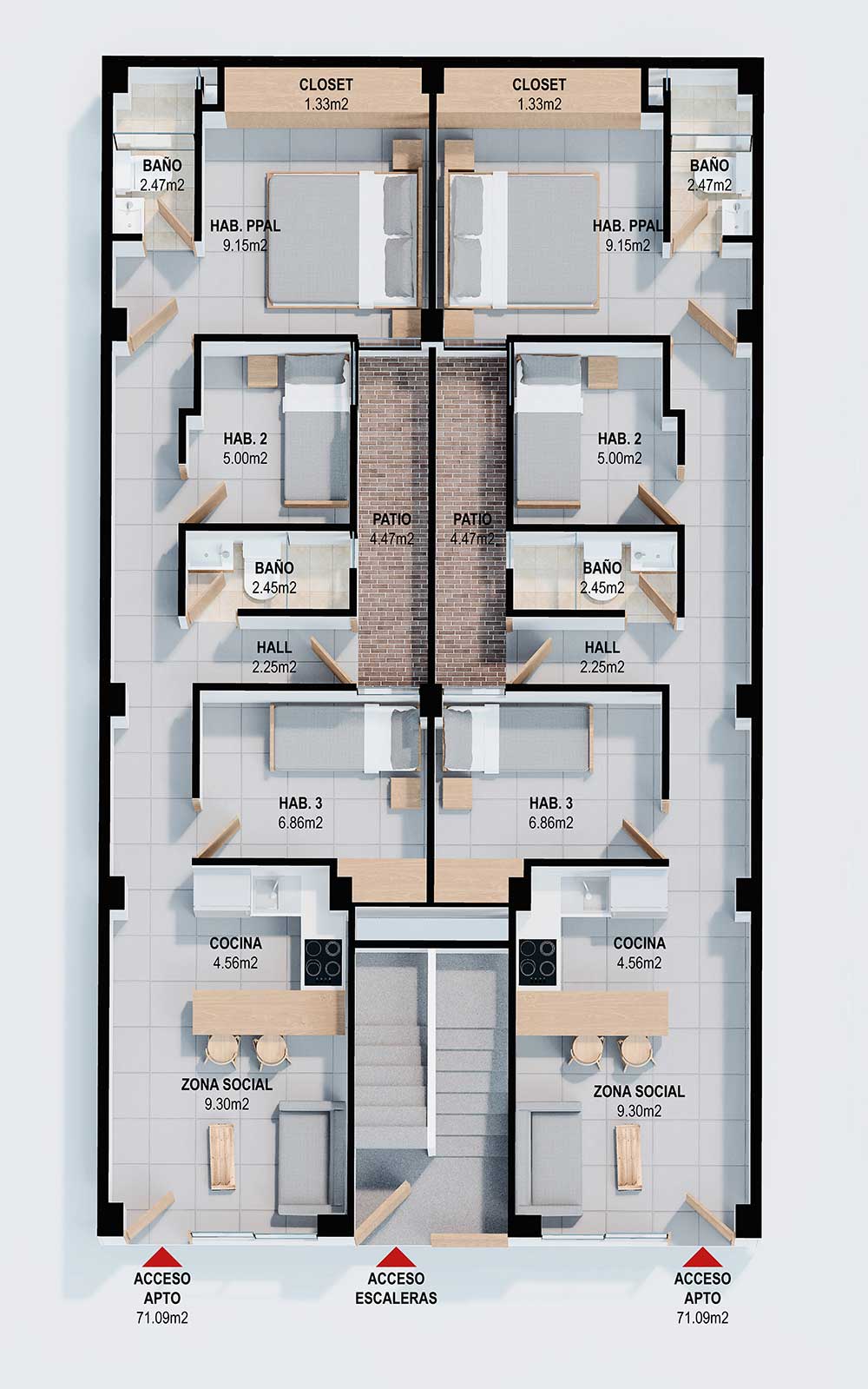 Área 70 metrosaproximadamente, 3 alcobas, 2 closets, 2 baños cabinados con vidrio templado, zona de ropas, cocina integral con mesón en granito pulido y cajoneras superior e inferior, cubierta y extractor, salón comedor, barra americana, ventanas en aluminio adonizado, cerámica de colección, aglomerado RH en muebles, closet y cocinas.