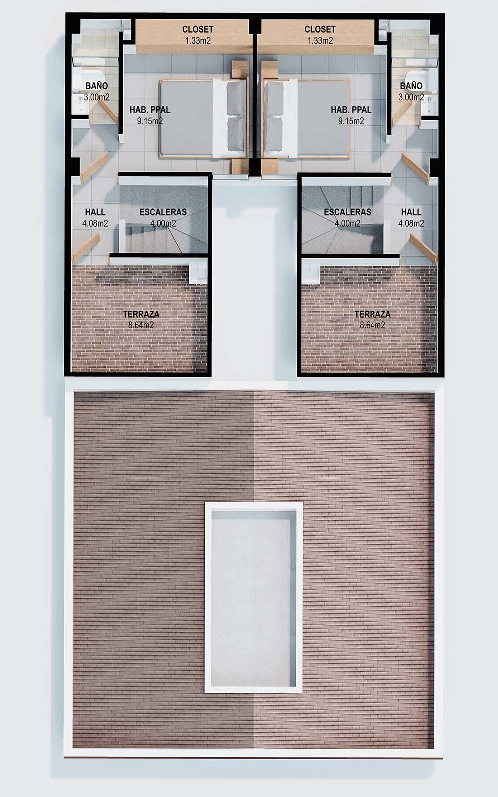 Área 97 metros2, aproximadamente, 3 alcobas, 2 closets, estudio, 2 baños cabinados con vidrio templado, patio en mansarda con zona de ropas y estar, cocina integral con cajoneras superior e inferior, cubierta y extractor, salón comedor, barra americana, balcón, ventanas en aluminio adonizado, cerámica de colección, aglomerado RH en muebles, closet y cocinas.